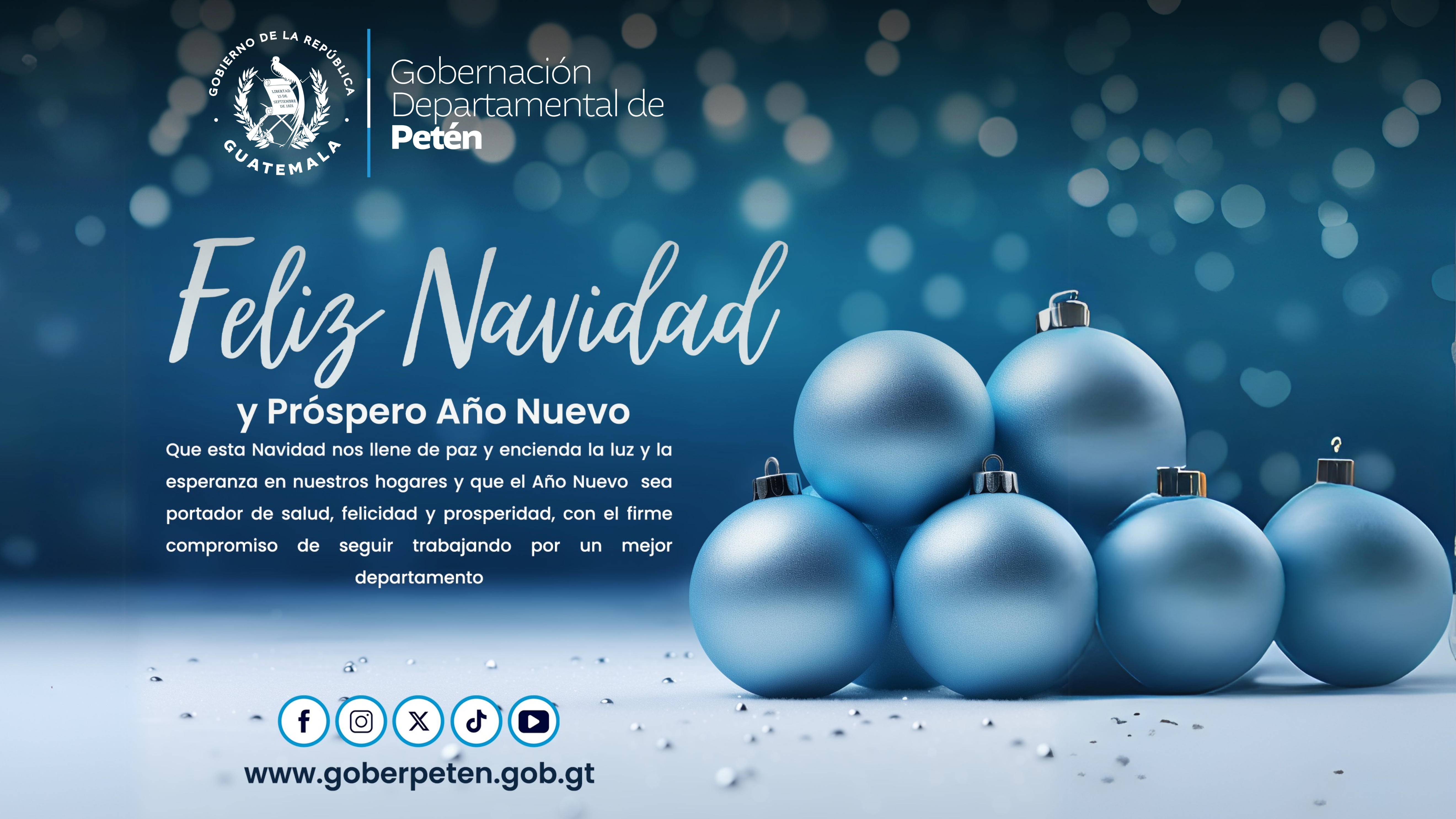 La Gobernación Departamental de Petén les desea una Feliz Navidad y un Próspero Año Nuevo 2025. Que esta época sea portadora de paz, esperanza y unión en sus hogares. Reafirmamos nuestro compromiso de seguir trabajando por el bienestar y desarrollo de nuestro querido departamento, construyendo juntos un mejor futuro para Petén.