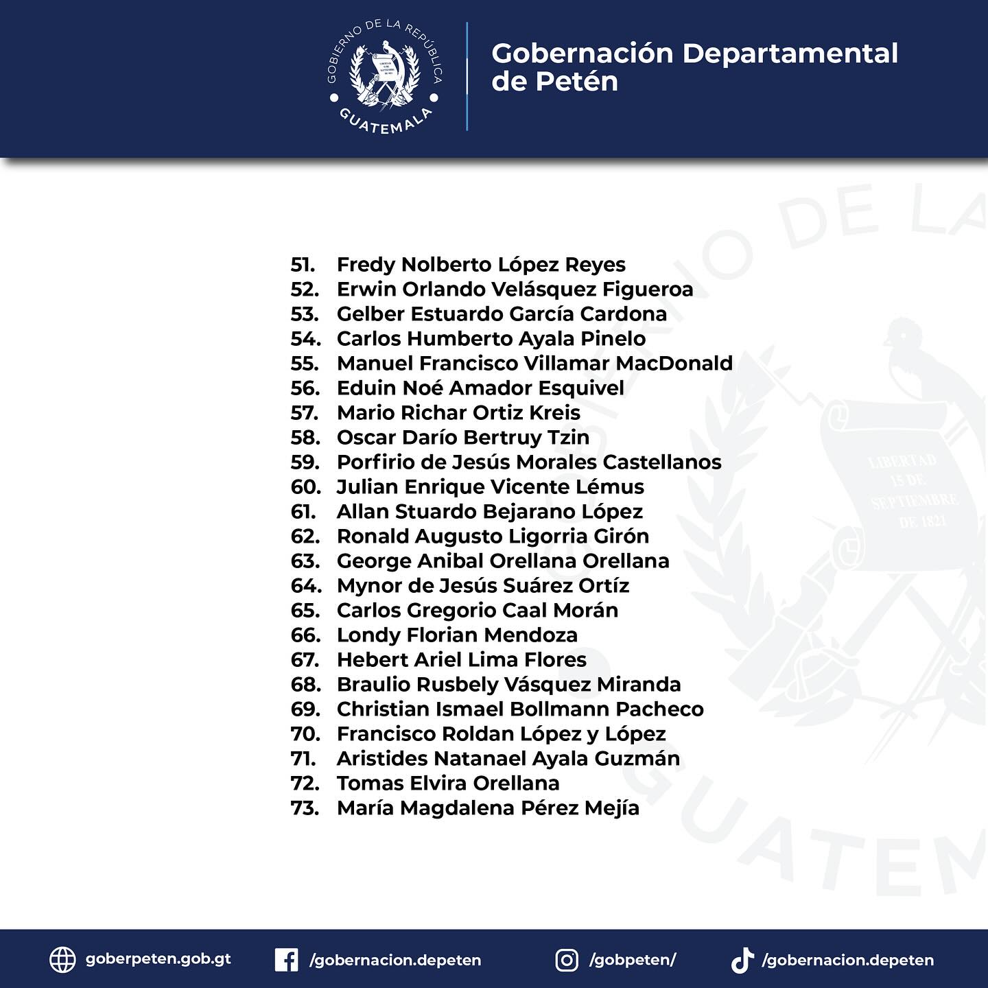 Estimada población del Departamento de Petén, presentamos el listado de las personas interesadas a optar al cargo de Gobernador(a) Departamental, que de acuerdo a la comisión de la junta receptora de los Sectores No Gubernamentales, acreditados ante el Consejo Departamental de Desarrollo -CODEDE-, cumplieron con los requisitos establecidos en la convocatoria.