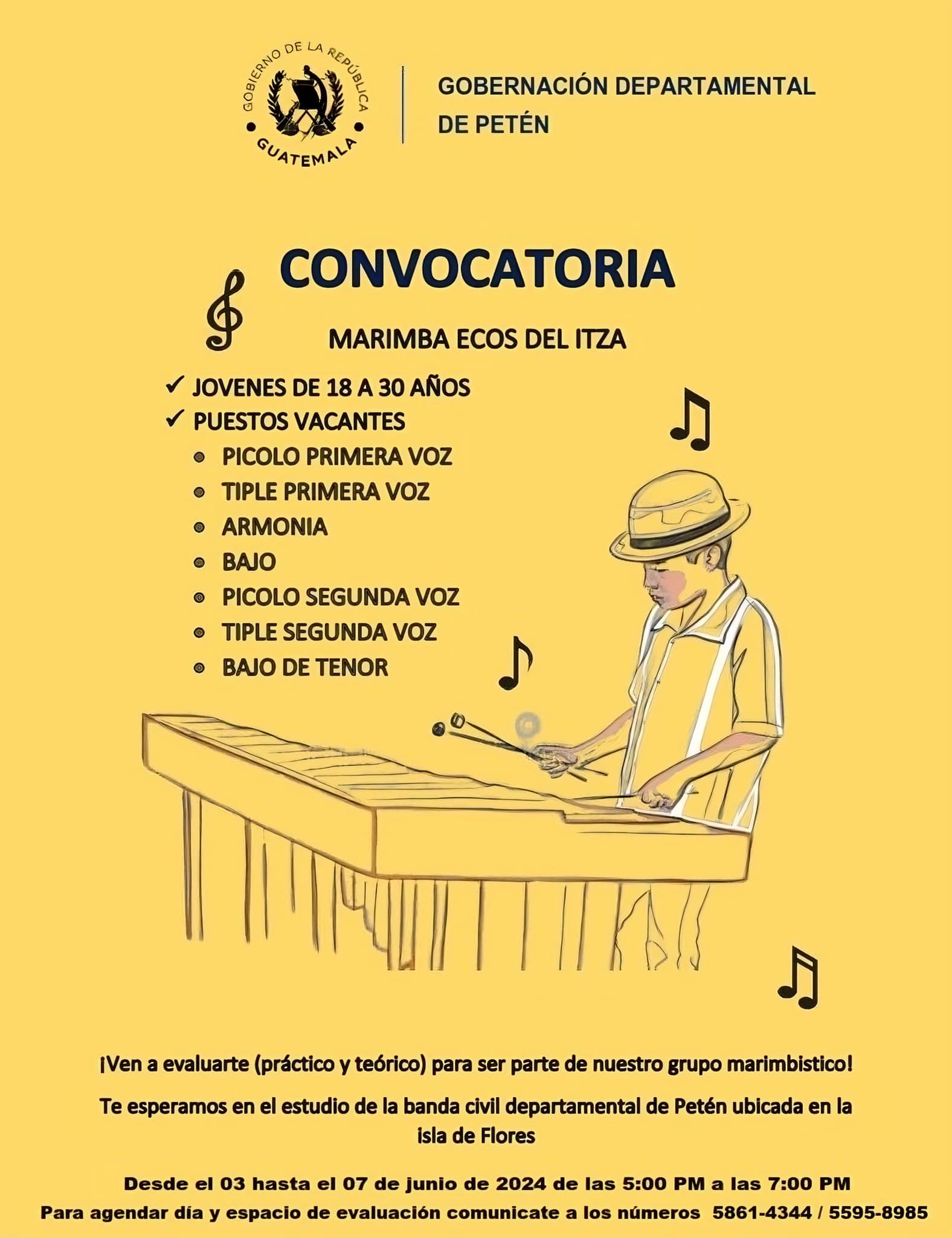 La Gobernación Departamental de Petén te invita a ser parte de nuestro grupo marimbístico. Si eres joven de 18 a 30 años y tienes pasión por la marimba, esta es tu oportunidad.